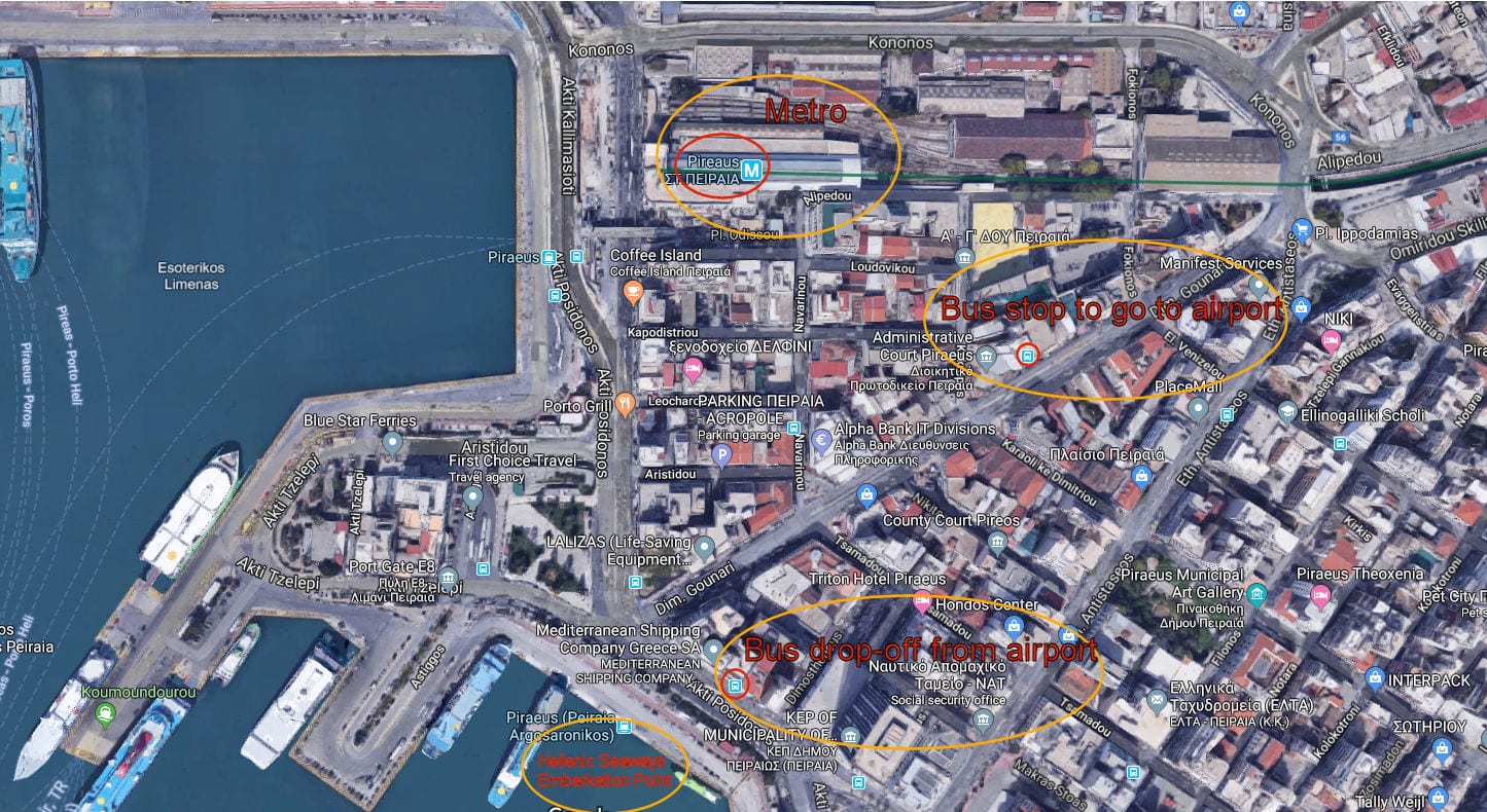 You will want to debark in Piraeus at the stop across a very busy street from Gate E8. Watch for other passengers debarking with luggage or ask your driver to signal when you’ve arrived at the correct stop. Scroll down for a map of where the bus will drop you off.