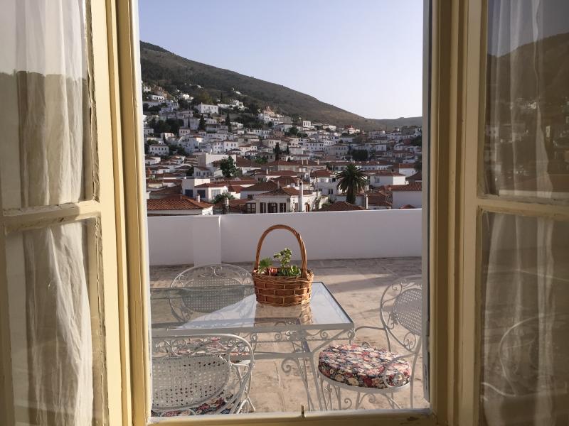 The second floor apartment, has two bedrooms, a kitchenette (with optional bed for 1 person), sleeps five people (the two bedrooms have A/C, the kitchenette has a fan); the rooms share one toilette/shower,as well as a large veranda with stunning views of the town, cascading from the hillside, as well as the harbor, Saronic Gulf, and Peloponnese.