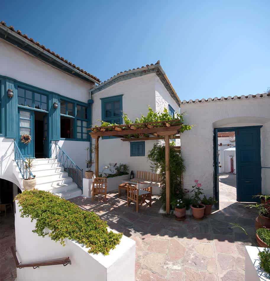 Just 100 m from Hydra Port, its architecture is representative of Hydra at the time of the Greek revolution; high walls, no balconies, a secluded garden and courtyards.