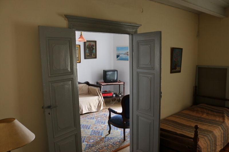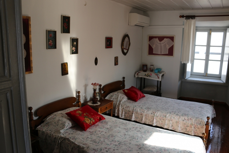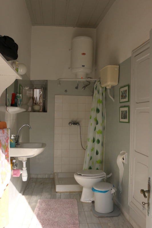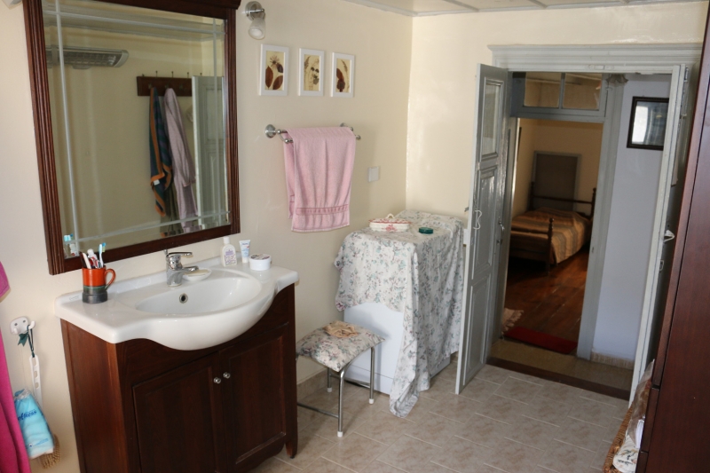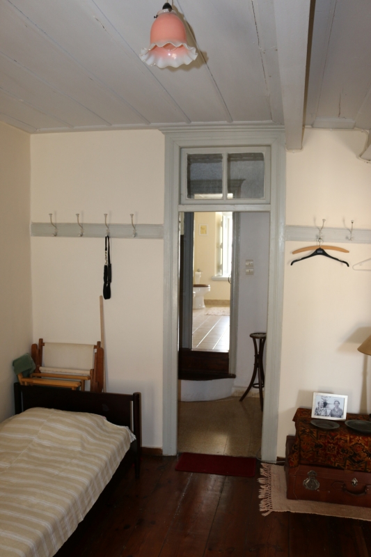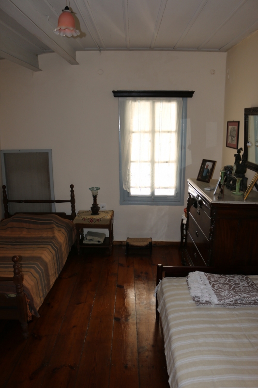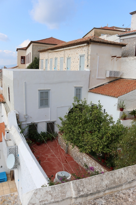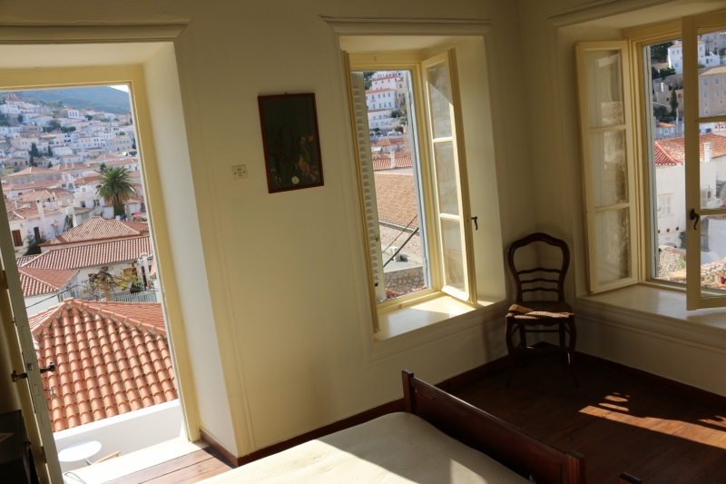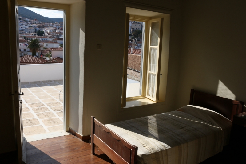 The second floor, with three bedrooms, sleeps six people (two bedrooms have A/C, the third has a fan); the three rooms share one toilette/shower, well as a large veranda with stunning views of the town cascading from the hillside, as well as the harbor, Saronic Gulf, and Peloponnese.